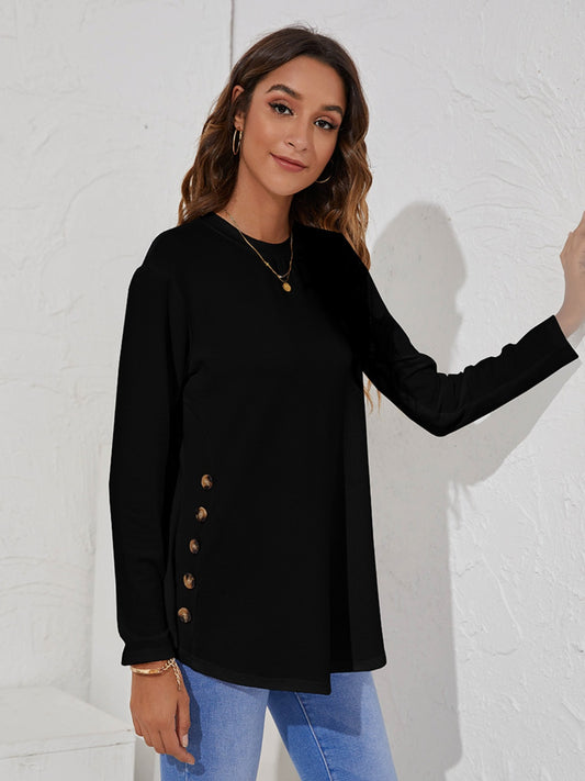 Decorative Button Round Neck Long Sleeve T-Shirt