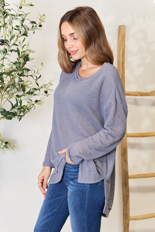 Basic Bae Waffle-Knit Round Neck Long Sleeve Slit Sweatshirt
